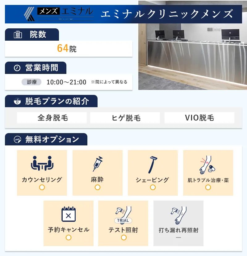 | クリニック | ![]() レジーナ クリニックオム > | ![]() メンズリゼ > | ![]() エミナル クリニックメンズ > |